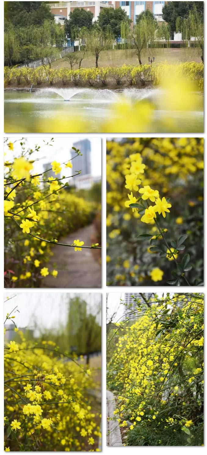 校園湖畔的迎春花已經盛放,黃燦燦的小花兒們明媚如春,見之令人心曠神怡。