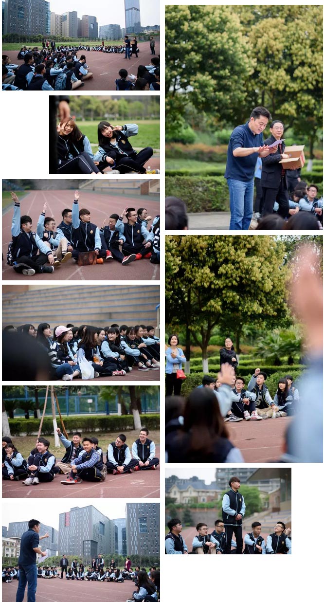 早上八點,全年級教師和學生在學校體育場集合,經年級組長劉昌明老師動員和安全要求后,全年級同學以班為單位參加了年級組組織的都江堰趣味知識搶答賽。