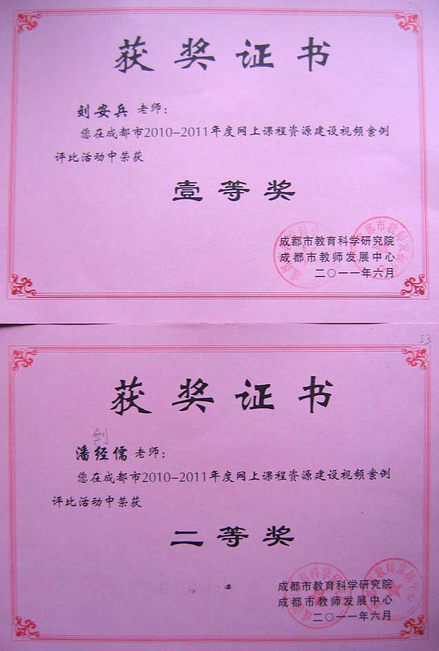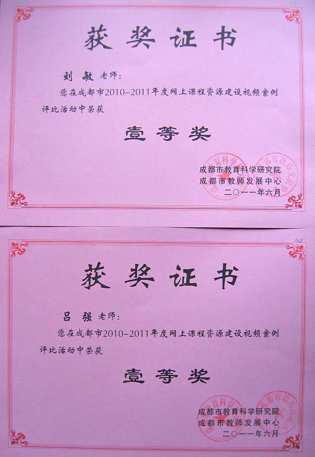 祝賀我校教師在成都市2010--2011年度網(wǎng)上課程資源建設(shè)視頻案例評比活動中獲獎!