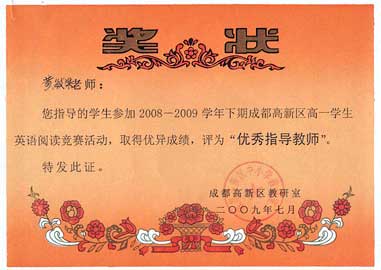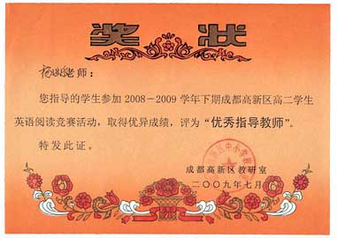 2009年成都高新區(qū)高中學(xué)生英語(yǔ)閱讀競(jìng)賽“優(yōu)秀指導(dǎo)教師”
