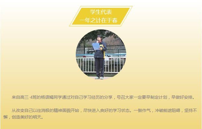 副校長(zhǎng)劉暉語(yǔ)重心長(zhǎng),對(duì)初一、高一年級(jí)的同學(xué)們,初二、高二年級(jí)的同學(xué)們,以及初三、高三年級(jí)的同學(xué)們分別諄諄告誡,并呼吁學(xué)子們發(fā)揚(yáng)拼搏精神,以堅(jiān)定的信心,務(wù)實(shí)的態(tài)度,百倍的努力投入到學(xué)習(xí)之中,全力以赴,起好步,開好頭,在美視這片美麗的土地上,綻放出最美麗的自己。