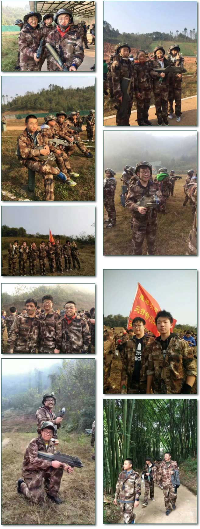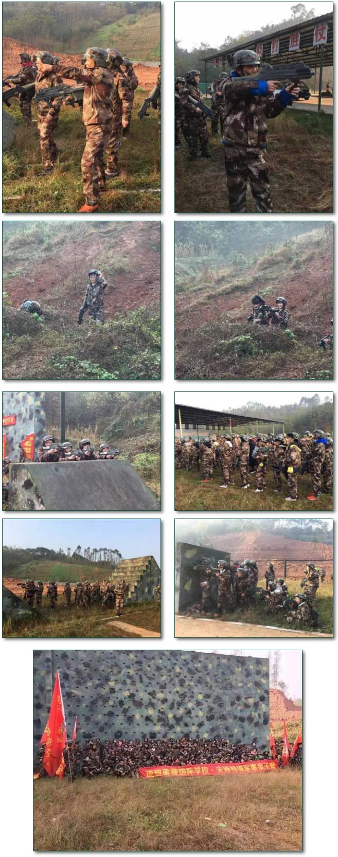 不過,在我們家長們的嚴防死守下,小家伙們末能成功。看他們心有不干,教官提議扭轉角色,由我們反攻。孩子們快速聚在一堆,進行戰略布署。我們家長也商量出一進攻”方案“,分不同的路線一起往前沖,人多,孩子們的槍打不過來。哈哈,我們媽媽們準備沖在前面當”炮灰“,讓身手矯健的爸爸們沖上山頭奪旗。在沖鋒號響起來時,黑壓壓的一片家長沖向敵方營地。一開始,孩子們被這架勢驚到了,拿著槍急急亂射。但很快,歷害的孩子們把我們一個個給”消滅了“。他們各處的神槍手在我們還沒有沖上山坡,就完美收官,讓家長們都”陣亡“了。