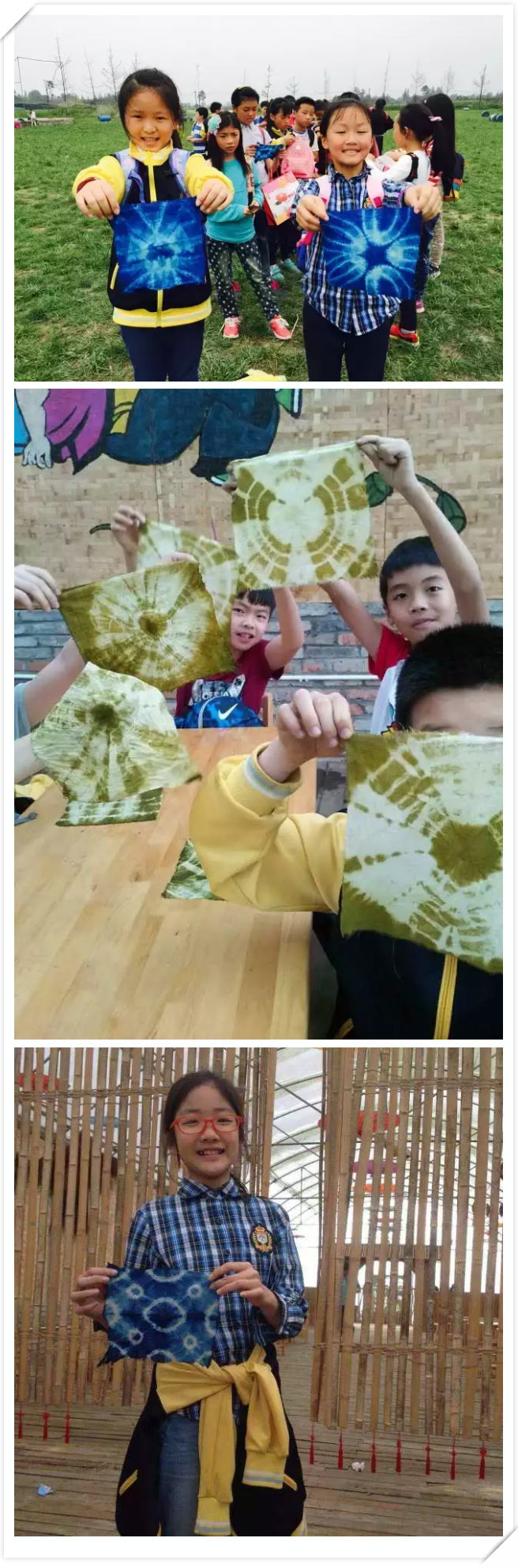 我興奮地把扎染拿進水池沖洗后一打開,哇!藍色布的中間點綻開了一朵藍色的美麗花朵。春天的花朵,已經從田邊花園走到了扎染布里。我愛這個創造美的春天!