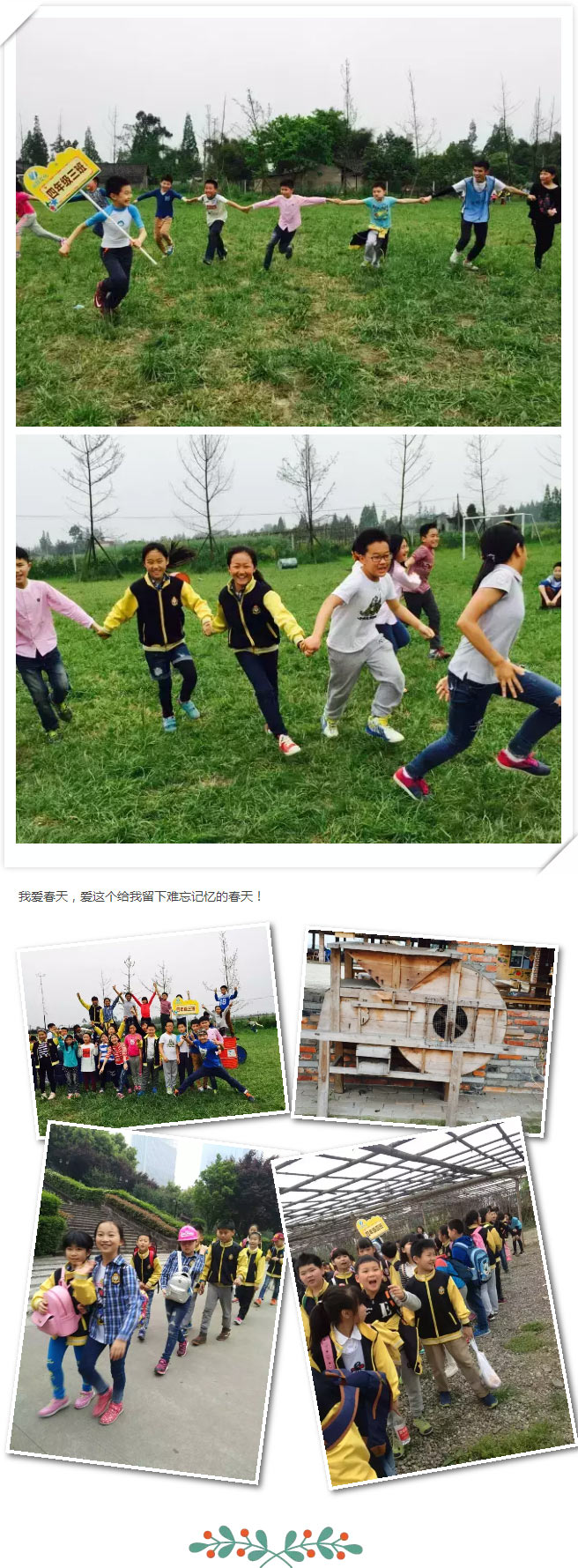 春天,是明媚的陽光,是如洗的藍天,是嫩綠的新芽,是五彩的花朵……這是我們對于春天的記憶。然而,今年的春游,和小伙伴們在“田園記憶”度過的一天讓我對春天有了新的認識和感受,帶領我們游戲的風趣“六哥”(一位大學的哥哥)也成為我春天記憶的一部分。