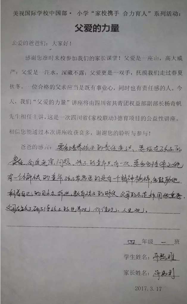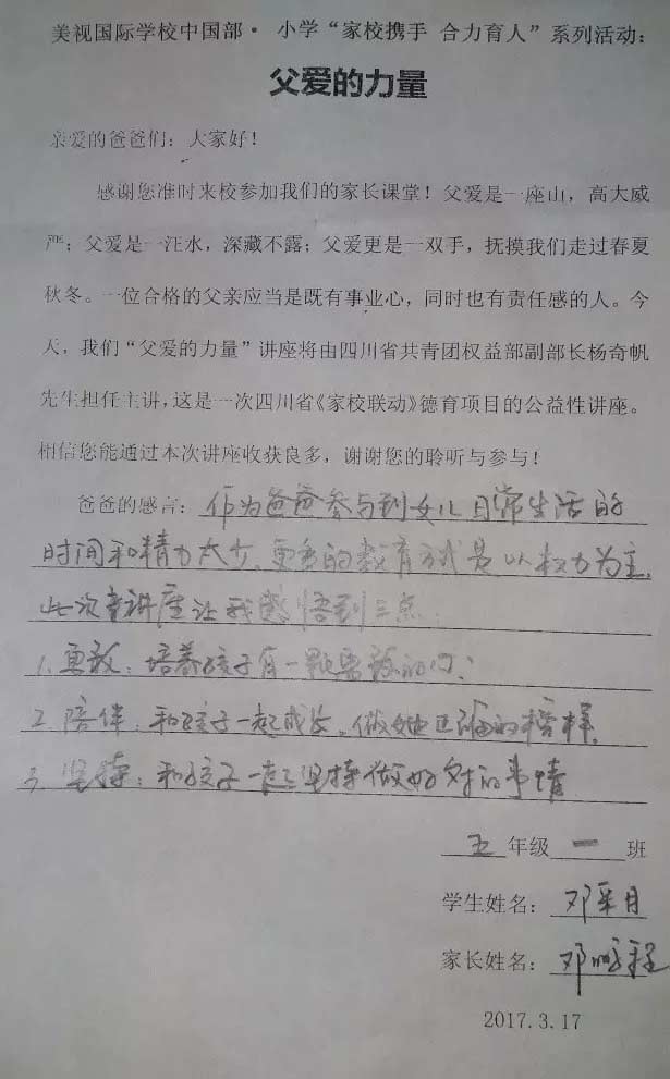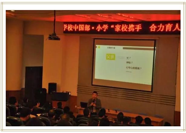 我們四、五年級(jí)的家長(zhǎng)有幸一起聆聽了中國(guó)部·小學(xué)“家校攜手 合力育人”系列活動(dòng)之“父愛(ài)的力量”的講座,其中來(lái)參加的絕大部分是爸爸,作為爸爸中的一員,聽了以后感觸頗多。