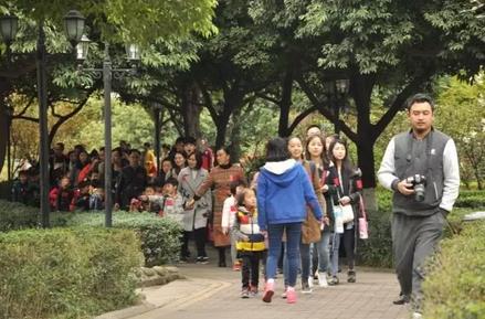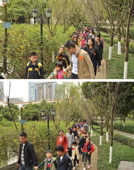 花影樹陰中,一雙雙小手牽著一雙雙更小而柔軟的手掌,雀躍,歡暢。三年級的哥哥姐姐們牽著“蒙寶”弟弟妹妹和“蒙寶”爸媽們游湖賞春呢!紅撲撲的臉蛋兒,紅撲撲的心情,點綴著人工湖邊一圃圃嬌艷春花,一處處爛漫春色!