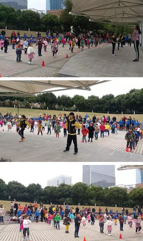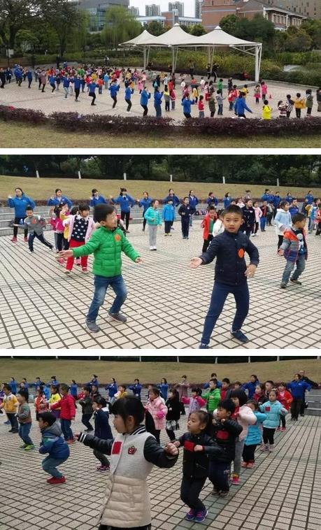 隨后,在韓老師和鄒老師的指導下,孩子們跟著哥哥姐姐們的步伐,跳起了室內操《快樂的小青蛙》。