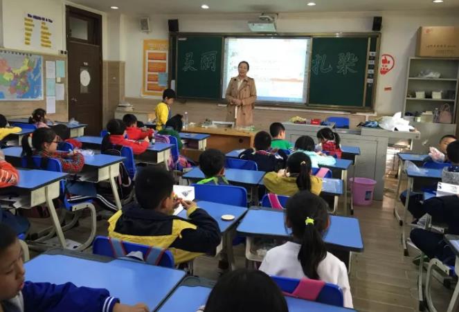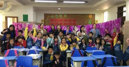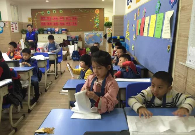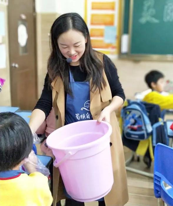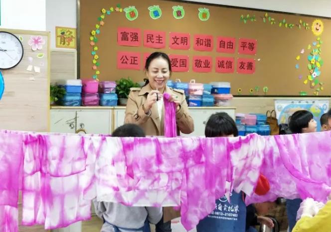成都美視師一學(xué)校中國部·小學(xué) 二年級二班溫柔親切的班主任扈老師幫忙孩子們分發(fā)染色后的作品