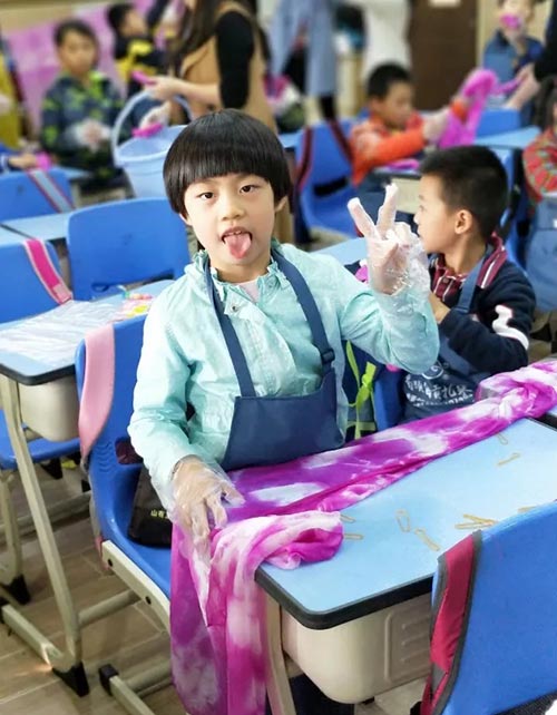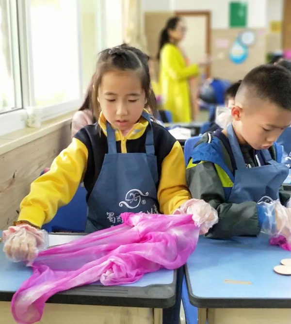 10月27日下午,由四川玉和祥珠寶旗下自貢市扎染工藝有限公司、成都美視師一學(xué)校聯(lián)合舉辦的“非遺文化自貢扎染DIY體驗活動”在成都美視師一學(xué)校沐秋而至,與孩子們一起領(lǐng)略了一場沉淀千年的絕美工藝。