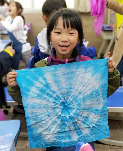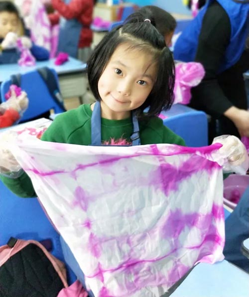 自由、創(chuàng)意、多變是創(chuàng)意扎染的特點,因其獨特魅力深受孩子們喜愛。四川玉和祥珠寶旗下自貢市扎染工藝有限公司帶著專業(yè)的扎染老師,為美視師一學(xué)校中國部·小學(xué)二年級二班孩子們現(xiàn)場講述、演繹扎染的工藝之美,讓孩子們不僅了解了自貢扎染的歷史起源、生活中的扎染應(yīng)用,更為孩子們悉心講解扎染的制作流程的工藝,并指導(dǎo)孩子們親自動手,體驗自貢扎染濃濃的魅力。