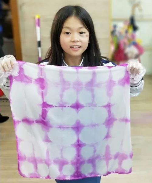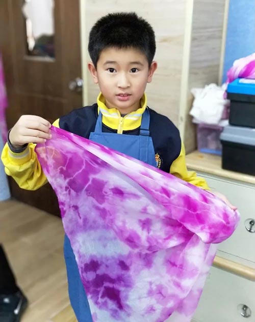 孩子們的扎染作品新鮮出爐了,一張張洋溢著自豪的笑容,歡樂的討論聲此起彼伏,孩子們紛紛表示要將自己扎染的絲巾、抱枕送給最愛的長輩們。通過本次自貢扎染DIY體驗活動,孩子們加深了對民族文化的興趣及了解,還制作出了獨一無二的“扎染”藝術(shù)作品。快樂有意義的童年也正應(yīng)該如此這般!
