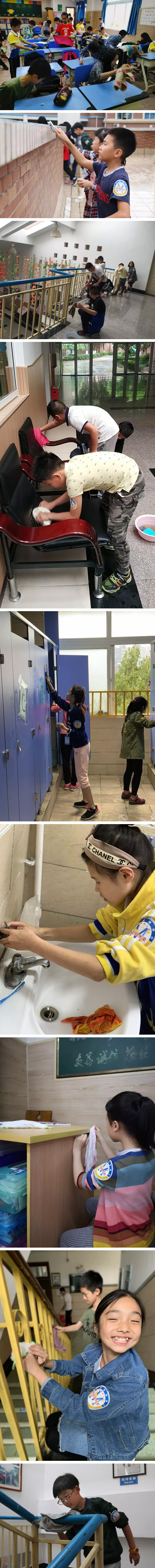 看!樓梯上躬身擦洗欄桿的身影,教室里認真打掃地面的小美寶,教學樓、圖書館、各公共區域……