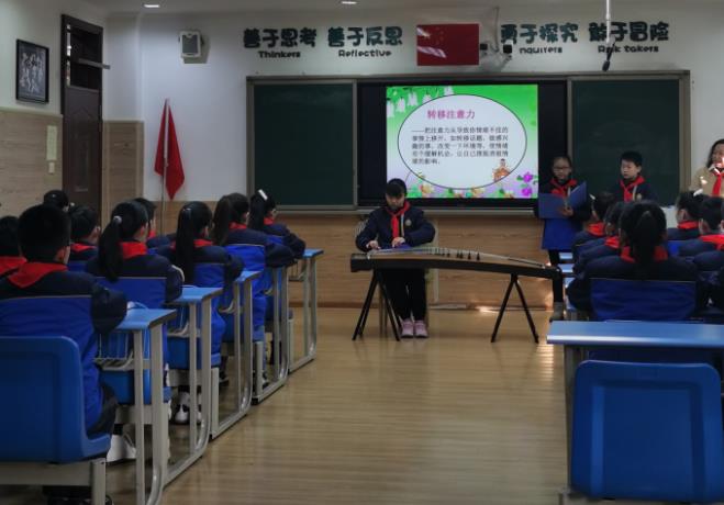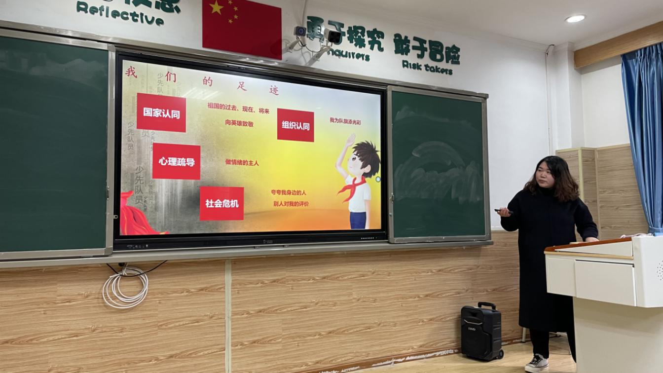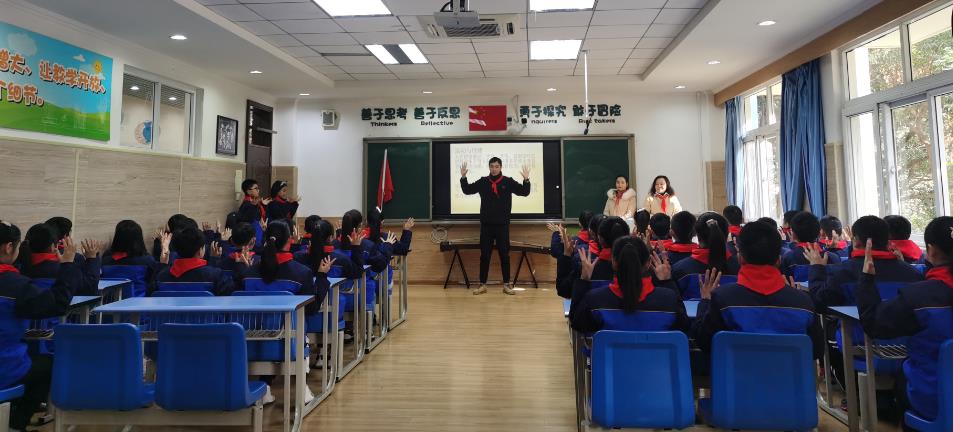 這節中隊課邀請了體育學科老師協作教學,讓隊員在運動中體會情緒與心率變化,應該維持怎樣的心率比較健康;數學學科老師和隊員一起創編小品,體現學科融合。