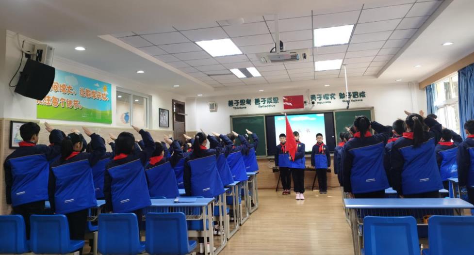 培訓會的第一項流程,由六一中隊呈現了一堂以“做情緒的主人”為主題的少先隊生命自護課:按照“三二三模式”,先進行“三報程序”(小隊長報人數給中隊長,中隊長報人數給中隊輔導員),再出旗、唱隊歌。