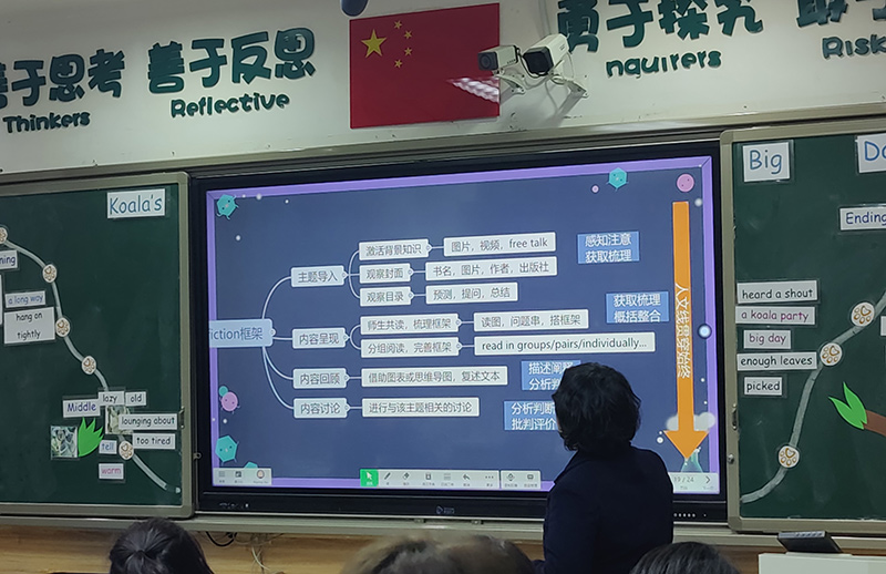 劉芮嘉老師通過KWL Chart,帶著學生回顧了第一堂課的內(nèi)容,從舊知過渡到新知。通過學生觀察封面(書名、圖片、作者和出版社)和目錄,培養(yǎng)學生對文本的解析能力和梳理知識的能力。在主要內(nèi)容呈現(xiàn)部分,從師生共讀到分組閱讀,層層遞進,讓學生更好的掌握了當堂課的知識點。最后,學生可以借助繪制的思維導圖,對文本進行復述。通過一個小視頻,給學生留下了思考的空間。知識來源于課本,根植于生活。