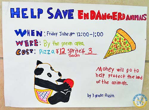 6月初,美視項(xiàng)目部三、四年級學(xué)生計(jì)劃通過“節(jié)省一畝地”項(xiàng)目為拯救瀕危動(dòng)物籌款。2012年6月8日周五中午,同學(xué)們在國際項(xiàng)目部中庭處售賣比薩,國際項(xiàng)目部師生踴躍購買比薩,為拯救瀕危動(dòng)物做一份貢獻(xiàn)?;顒?dòng)結(jié)束后,同學(xué)們籌得的資金,可以為拯救瀕危動(dòng)物節(jié)省兩畝土地。