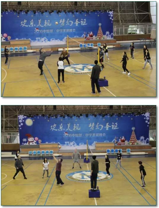 場上運動員時而躍起,用力將球拍打過網(wǎng);時而伏地接球,將球高高拋起。他們傳球、運球動作連貫,
