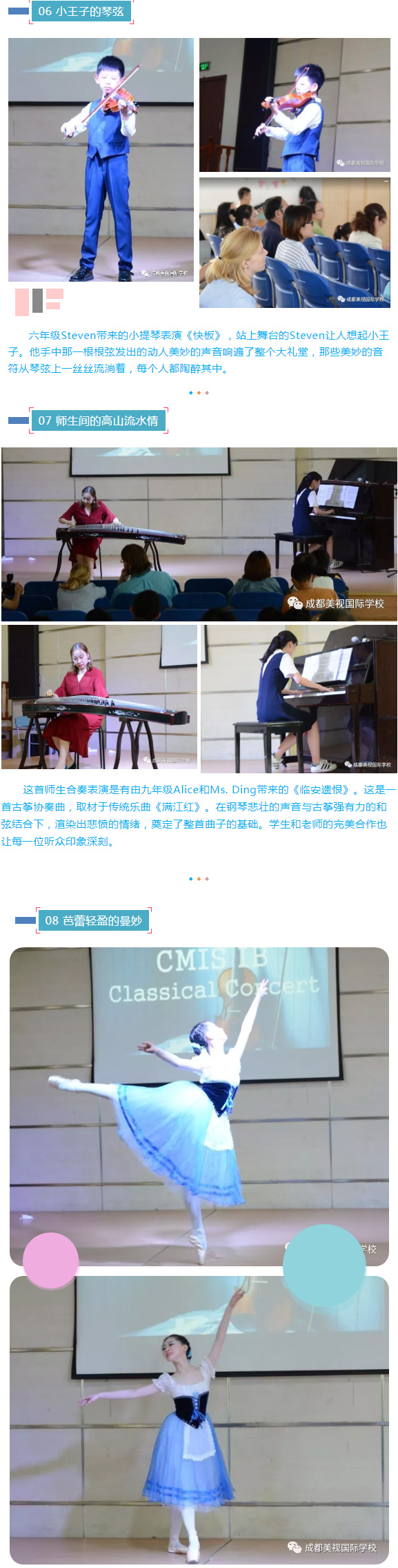 10年級Isabella的芭蕾舞表演《Ballet suite coppelia》有些出乎音樂會的意料。她輕盈的踮腳,舒展地抬手,宛如一只優雅的天鵝,十分驚艷。她在舞臺中央轉啊轉啊,吸引著每一個觀眾的目光...