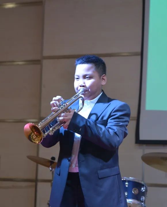 隨后是7年級Sunny帶來的小號表演《勝利》(Victory)。小號聲音響起,音符穿過每個人的耳朵躍動著,描繪著音樂的繽紛色彩。