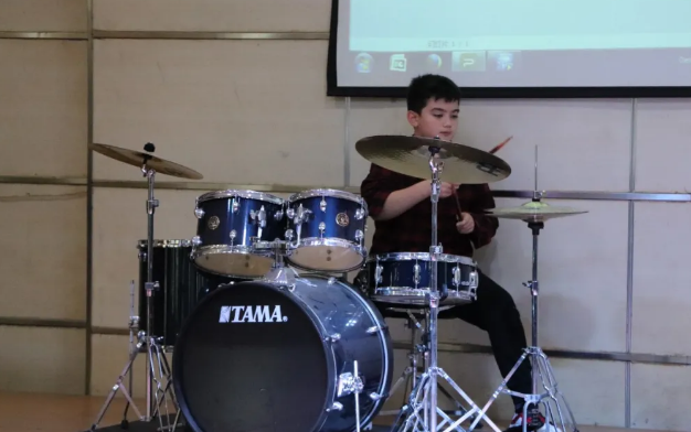 第一個節目是由6年級的Percy帶來的架子鼓表演《就讓我高興吧》(Just Groove Me),鏗鏘有力的鼓點和鮮明的律動一開場就點燃了整個大禮堂,讓聽眾切身感受到了秋日的一抹熱情之火。