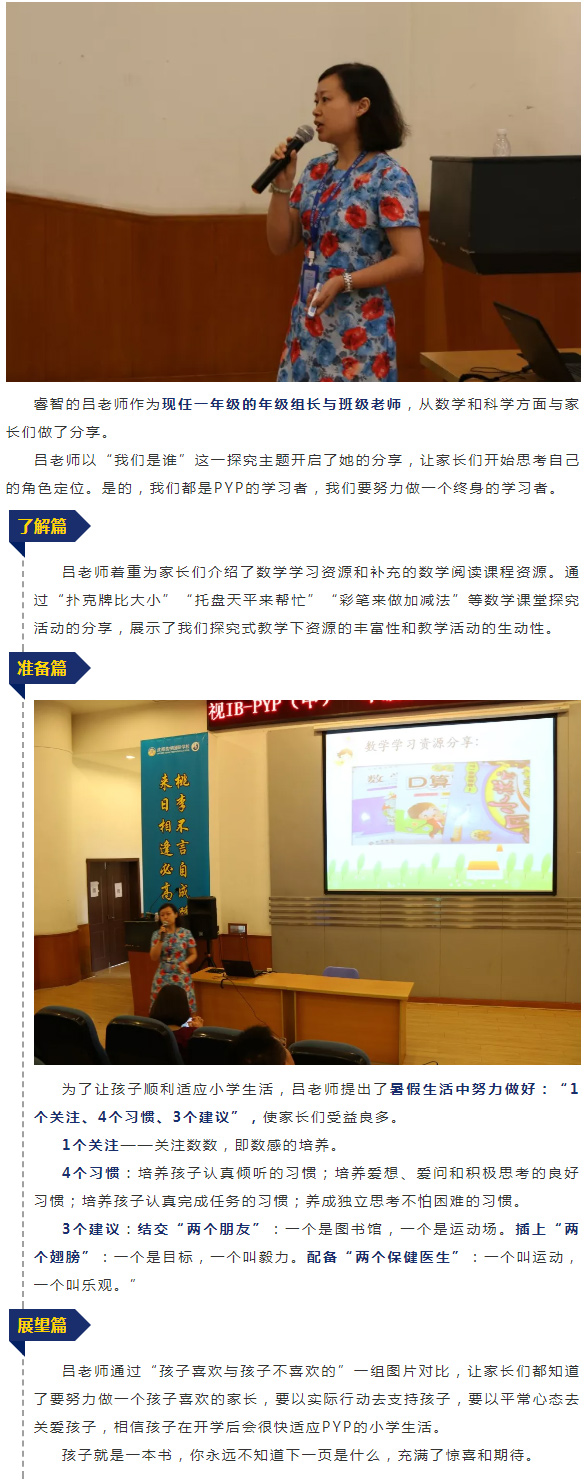 雷主任就家長(zhǎng)們關(guān)心的話(huà)題做了詳細(xì)地講解,與家長(zhǎng)一邊互動(dòng)答疑,一邊介紹《PYP家長(zhǎng)手冊(cè)》,讓寶爸寶媽們對(duì)學(xué)校的作息安排、課程安排、生活中心、宿舍管理以及入學(xué)用品準(zhǔn)備等都有了全面地了解。