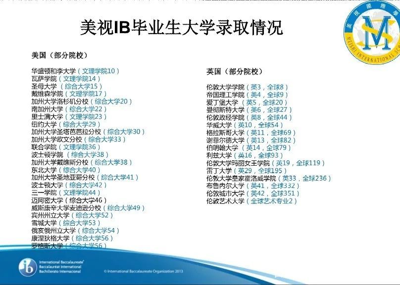關于成都美視師一學校IB畢業生大學的錄取情況,首先是美國留學在畢業生的留學方向大概占了百分之五十,一半左右的學生目標是美國的院校,美國的大學中包括綜合大學和文理學院排名都比較好的學校。首先比如全美文理學院排名前十的華盛頓和李大學,綜合大學排名前二十的圣母大學、加州大學洛杉磯分校UCLA等一些耳熟能詳的學校,以及一些在專業上比較強的院校比如說紐約大學、加州大學戴維斯分校、圣地亞哥分校等等,這些都是在一些專業領域上非常強的學校。
