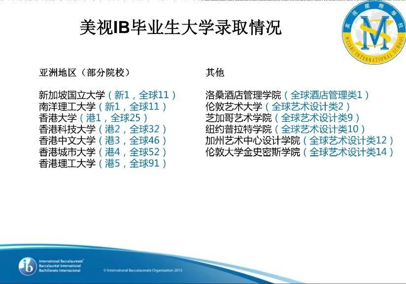 其他地區包括亞洲排名最高的新加坡國立大學、南洋理工、港大包括香港前五的大學,以及一些專業類的院校,比如全球酒店管理專業排名第一的瑞士洛桑酒店管理學院,還有美視每年也有一些學生去申請關于藝術類的院校,無論是美術專業還是設計專業每年都有這樣的學生,錄取的院校包括倫敦藝術大學、芝加哥藝術學院、紐約普拉特學院、加州藝術中心設計學院等等。
