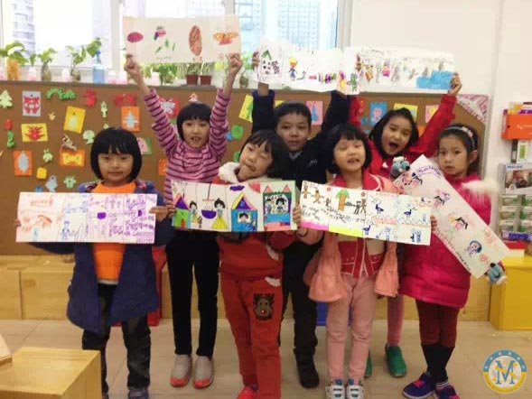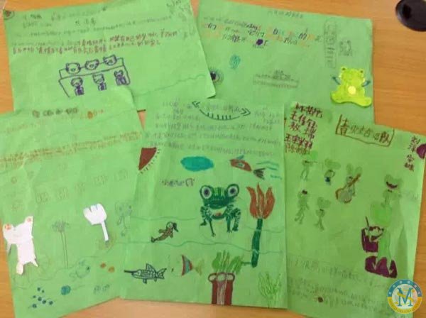 美術課上,我們分小組編故事,繪故事,設計個性封面和封底,整理成書。精彩絕倫的美術作品是孩子們最好的禮物;