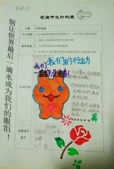 周末回到家,我們就立即旋風般行動起來!召開家庭會議,共同制定一份節水計劃,時時刻刻相互警醒......探究的成果扎扎實實地駐守在我們的價值觀和生活中,節約用水的“小種子”更在我們心中繁茂生長,并隨著春風,四處擴散發揚。