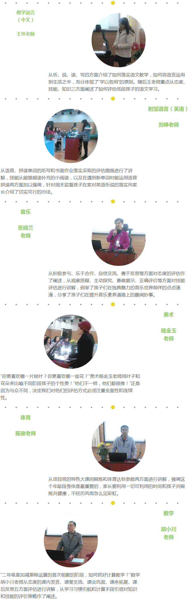 他詳細地介紹了小學項目對評估的觀點,強調教師和學生雙方的自我評估與反思,評估的原因、內容及方式,我們現采用總結性評估和形成性評估兩種方式,以及采用哪些評估策略、評估工具綜合全面評估孩子成長的歷程。