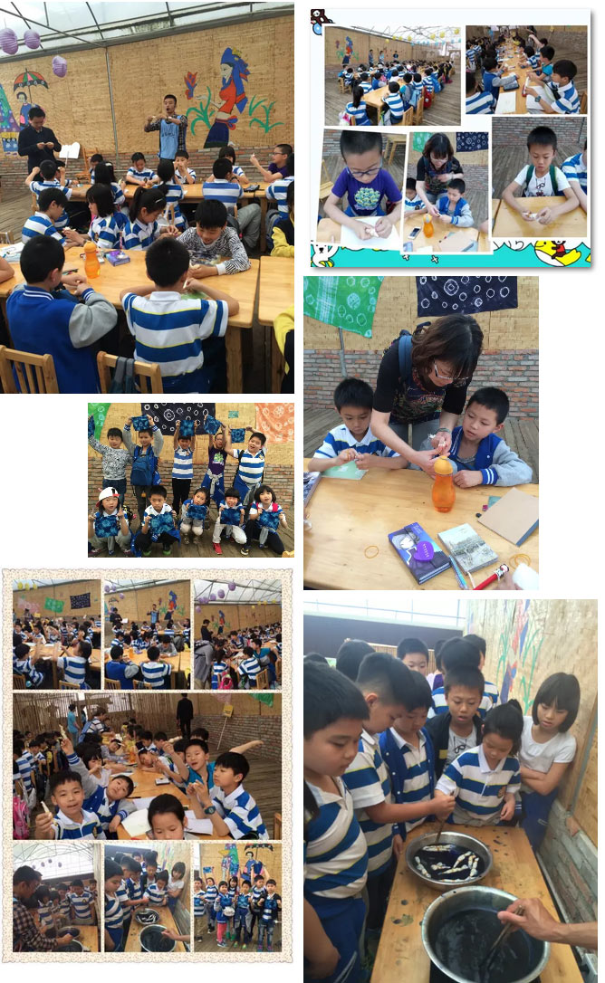 一聽老師講解才知道我們馬上要體驗“白族扎染”。老師說:“我們要把白棉布染成一個五角星,制作過程簡單:先要折圖案,捆扎好,接著用清水浸泡,放進染鍋染色,最后沖洗晾干。”我們在老師的帶領下有條不紊地一步一步地做。