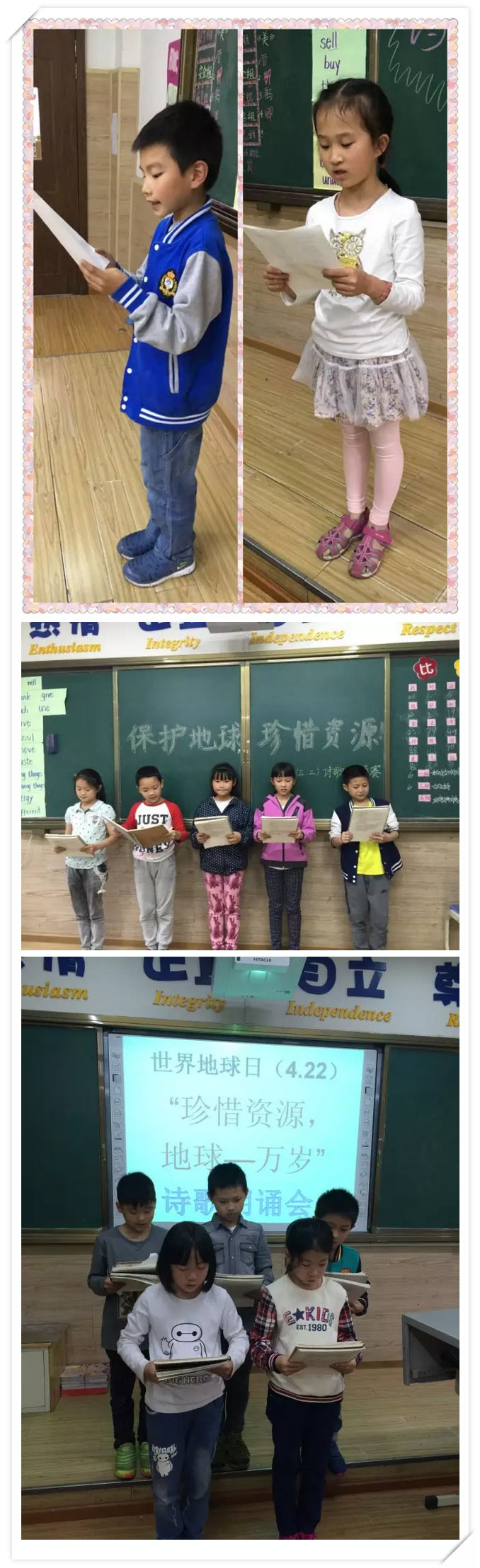 這一天,我們各班還舉行了“珍惜資源,保護地球”的詩歌朗誦比賽呢!愛在詩歌朗誦里,愛也在深情地呼喚里:“只有一個地球,地球資源不是取之不盡用之不竭的;只有人人愛地球,地球才會愛人人……”