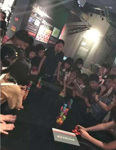 我們用積木和儀器,仿真示范地震的強度和破壞力。
