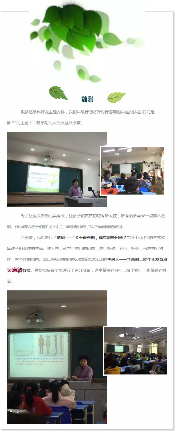 孩子們都聽得很認(rèn)真,他們一面回答吳教授的問(wèn)題,一面又積極思考,提出新的問(wèn)題。他們提問(wèn)彬彬有禮,回答問(wèn)題落落大方,態(tài)度真誠(chéng)而積極,顯示出PYP學(xué)子良好的探究態(tài)度。看來(lái),孩子們真的在進(jìn)行“學(xué)術(shù)”交流,將青春期當(dāng)作成長(zhǎng)的課題在探究。