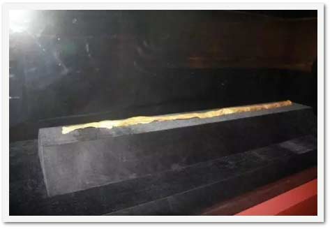 這是世界上最早的金杖,他是用金條捶打成金皮后,再包卷在木杖上,出土時能看見金皮內殘留的碳化木渣。長142厘米,直徑2.3厘米,重約500克,上有刻劃的、魚、鳥、人物等圖案。此圖案究竟表示何種內容呢?是古蜀族圖騰、族徽的銘記嗎?