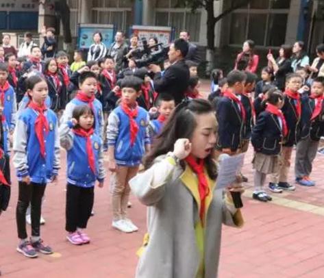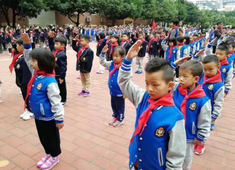 5.1班的大隊委代表馮可人帶著大家在隊旗下莊嚴宣誓:一當火車頭,各項探究能帶頭;二當孺子牛,熱心服務勤奔走;三當水中魚,分享交流做朋友;四當智多星,多出點子會創新;五當小火箭,努力向上向前進。
