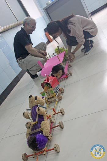 歷時(shí)30分鐘,每個(gè)小組都經(jīng)歷了提議——實(shí)踐——失敗——重新提議的過程,有些小組甚至失敗10次。但最終集合所有成員的智慧,每個(gè)小組都成功地完成了任務(wù)。同學(xué)們的創(chuàng)造力受到了Dr. Joe的高度贊揚(yáng)。最后,4個(gè)小組的作品成功地連接成了一列火車,同學(xué)們爆發(fā)出了開心的笑聲。