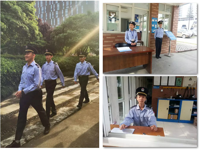 8點,四個男孩穿著制服迎著雨后第一縷陽光亮相校園。巡邏、監控、接待、檢查是保安們每天的工作內容,他們每兩個小時換一次。