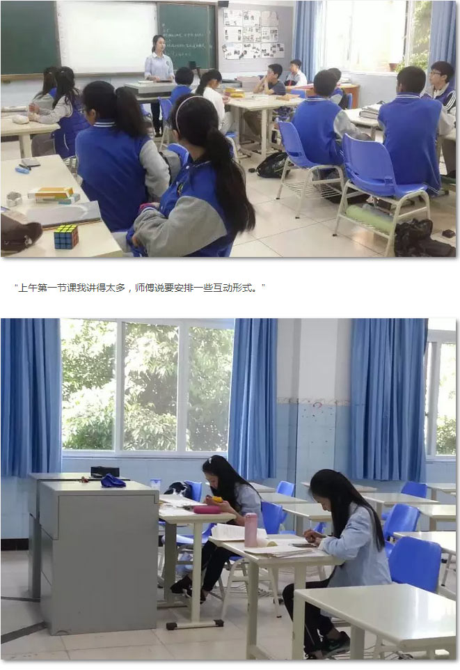 7點35分,中文助教孫妍睿同學已到教室。今天有一節早自習,三節中文課需要和比自己小或大的孩子在一起。給比自己小的孩子要安排《童年》探究,比自己大的孩子要安排《詩經》探究。