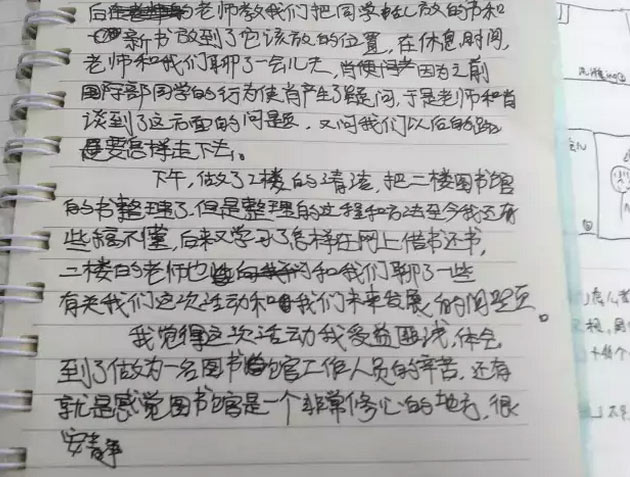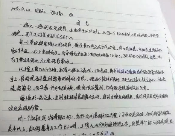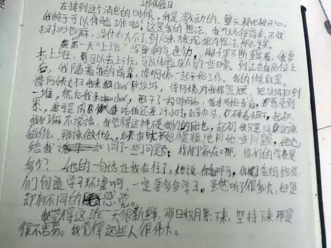 第一天上班,渾身朝氣蓬勃。腦子里不斷重復著:我要去上班!我可以去上班!可以體驗一下成人的日常生活!干了一段時間,我的手開始發痛、累、軟。這才10點呢,離下班還有2小時。沒法,只有硬著頭皮干。我這個工作唯一能接觸的人群就只有阿姨。于是,我開始提問,起初問一些工作上的。然后,阿姨也會順著我的提問問我一些問題。在這一過程中,阿姨的一句話把我鎮住了:“你看啊,你爸爸媽媽給你創造的學習環境多好啊,一定要多多學習。”這樣的話在其它場合聽了很多次,但這次聽起來特別有觸動。這一天的工作對于我來講很新鮮,但每天這樣堅持下來是很不容易的。我覺得做這些工作的平凡人很偉大。
