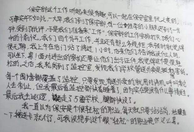 一直以為保安是一個很輕松的職業,每天只要站站崗,檢查一下接送卡就行了。可我沒想到這個“輕松”的職業居然這么累。