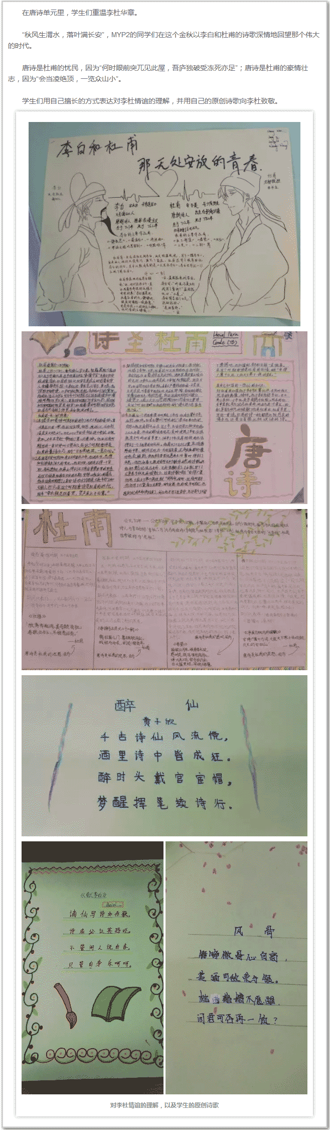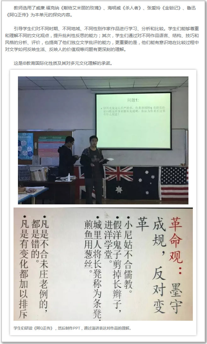 IB-MYP開展以概念驅動,探究為基本形式的教學。教師們根據概念和全球背景,確定本單元的探究說明,這是每個單元最為核心的內容。再選擇有利于探究的各種內容,幫助學生理解概念,提升思維能力。中學項目的語言與文學教學,不同于傳統語文教學,不拘泥于固有的文章分析方法與標準答案,而賦予了學生們理解作品的自由。賞析各種文學與非文學作品,運用文字表達自己的觀點或創作作品,百家爭鳴撞擊出思想的火花,這樣自由的氛圍怎能不吸引人!有家長朋友感嘆美視MYP的教學好超前,老師們的方式好新穎;學生們常說看似輕松學習的背后實際上需要付出更多艱辛的努力,但是即便如此他們也愿意,也許這就是IB-MYP的魅力吧!