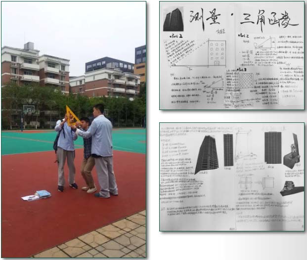 在這個(gè)過程中,學(xué)生將要識(shí)別針對(duì)各個(gè)情況最有效率的計(jì)算模型并嘗試得出最簡化的公式,運(yùn)用自制的測傾儀等等工具測出可測的數(shù)據(jù)并通過公式得到這些數(shù)據(jù)和未知數(shù)據(jù)的關(guān)系,最后計(jì)算出樓高。