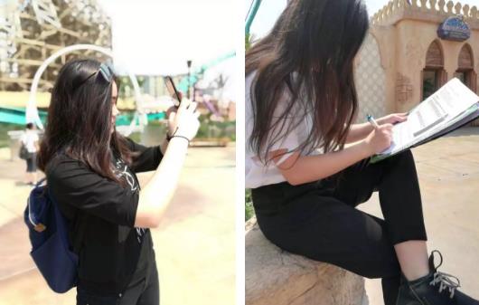 同學(xué)們按照任務(wù)要求,拿出作業(yè)本來收集信息,觀察、記錄并計算信息。為了收集足夠的數(shù)據(jù),同學(xué)們互相配合,拍攝照片,記錄了整個游樂項目的視頻,還及時詢問工作人員相關(guān)信息。