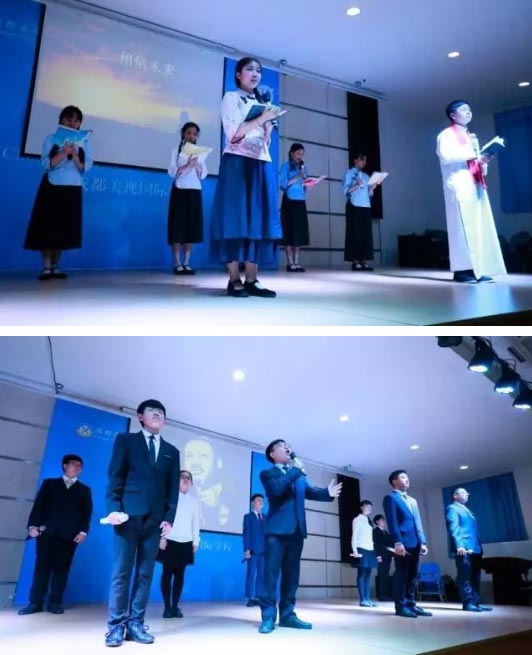 從選稿、配樂、訓練、服裝、隊員磨合,再經過層層的嚴格選拔和精心修改,初高中一共17支隊伍,分別代表了自己的班級,懷揣著對朗誦這一語言藝術的熱愛、對美好生活的謳歌,站上舞臺,為老師、同學還有家長們,獻上了一臺高水準的精彩朗誦。