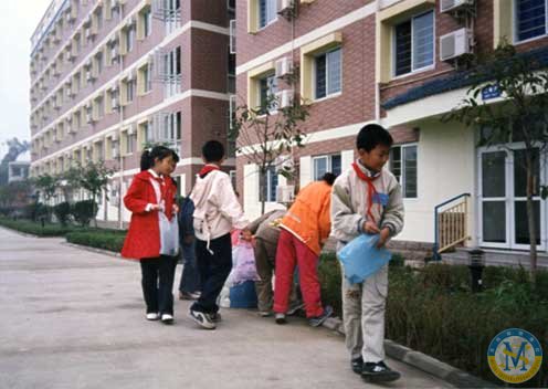 在宿舍樓外清理垃圾