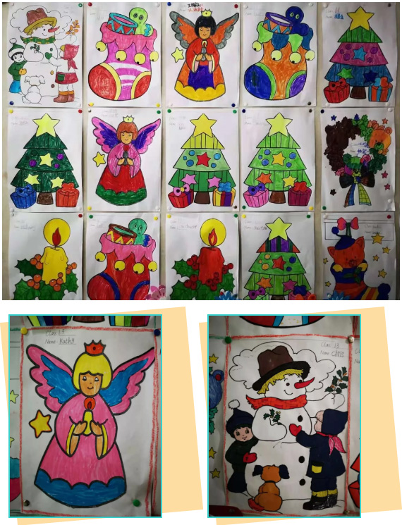 走進二樓過道,這里有一年級寶貝們的圣誕元素英文寫繪展示。作為學校里最小的乖乖們也能用英文寫出好多單詞,是不是很棒啊?從小在國際文化的熏陶下成長,孩子們都是具有國際視野的小小中國人。