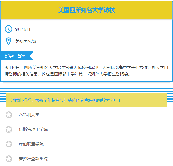 本次大學招生咨詢會是本學年第一次融合部全體高中生參加的大學咨詢會。在接下來的數月里,來自多所海外大學的招生官將陸續到訪我校,為學生們提供更多的海外大學申請方面的信息。