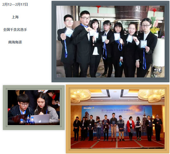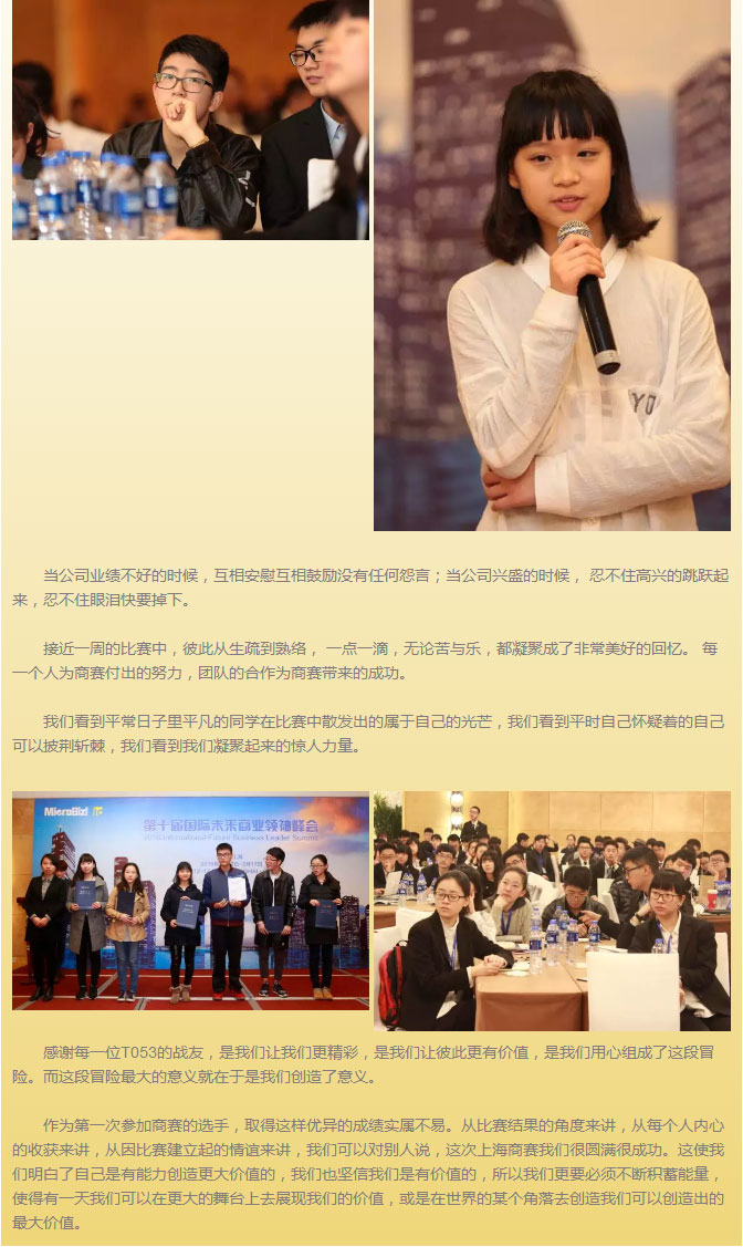 在2月12日至17日于上海舉行的第十屆國際未來商業領袖峰會上,為期六天緊張的商賽帶給參賽者們一個完整全面的商業體驗。面對來自全國各地的一千多名選手,我校中學部學生艾鳳吾(T076)、姜欣蔚(T053)等14名同學沉著應戰,穩定發揮,最終憑借自己的實力獲得了58份證書,創造比賽佳績!“商業模擬挑戰賽”是一套實用的商業模擬訓練方法,它起源于20世紀50年代的歐洲,通過系統的企業管理仿真模型,最大限度還原企業運營狀態。