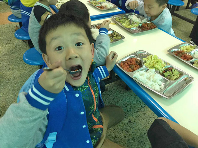 看,孩子們正在食堂大快朵頤,吃得很開心。